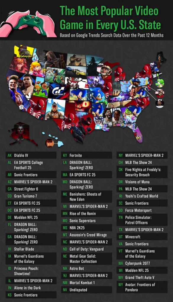 Seven states — Arizona, Illinois, Michigan, New Jersey, New York, North Carolina, and Texas — have “Marvel’s Spider-Man 2” as their most desired title, which takes the most states in the study. Tied for second-most are “Dragon Ball: Sparking! ZERO” and “Sonic Frontiers,” which took four states apiece. Wrapping up the top five were “EA SPORTS FC 25” (three states,) and a three-way tie between “MLB The Show 24,” “Marvel’s Guardians of the Galaxy,” and “Madden NFL 25” which took two states apiece.