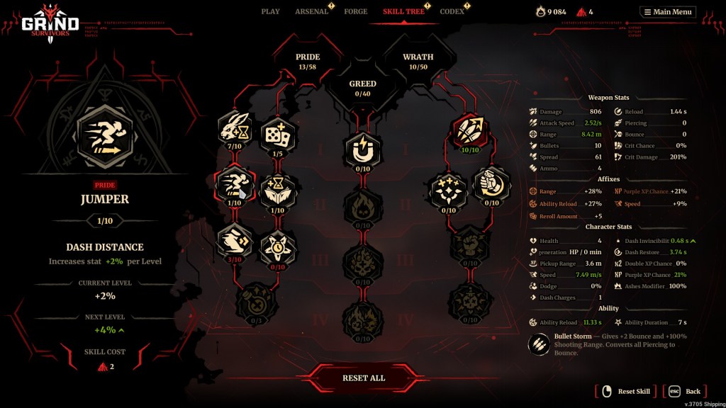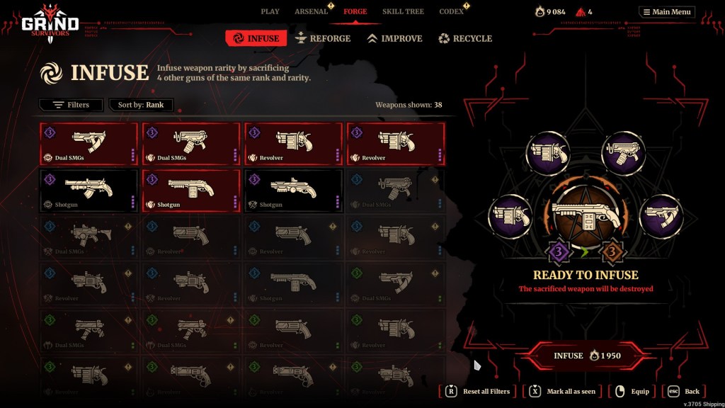 Grind Survivors adds upon this formula with various roguelite elements, like a talent tree and an expansive armory system. Players can upgrade their guns to improve their passive abilities, reroll their stats, and upgrade their rarities by sacrificing other guns of the same rarity.